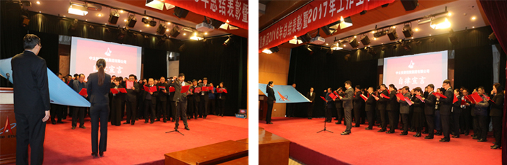 根據會議安排,中太建設集團副董事長燕振義、總裁吳建國作為領誓人,分別引領中太投資控股集團下屬單位董事、監事及中層以上領導干部進行自律宣誓,宣誓人分別在誓詞上簽字,并承諾2017年將恪盡職守、奮發向上,全身心投入到企業發展上來,做合格的企業引領人和決策者。